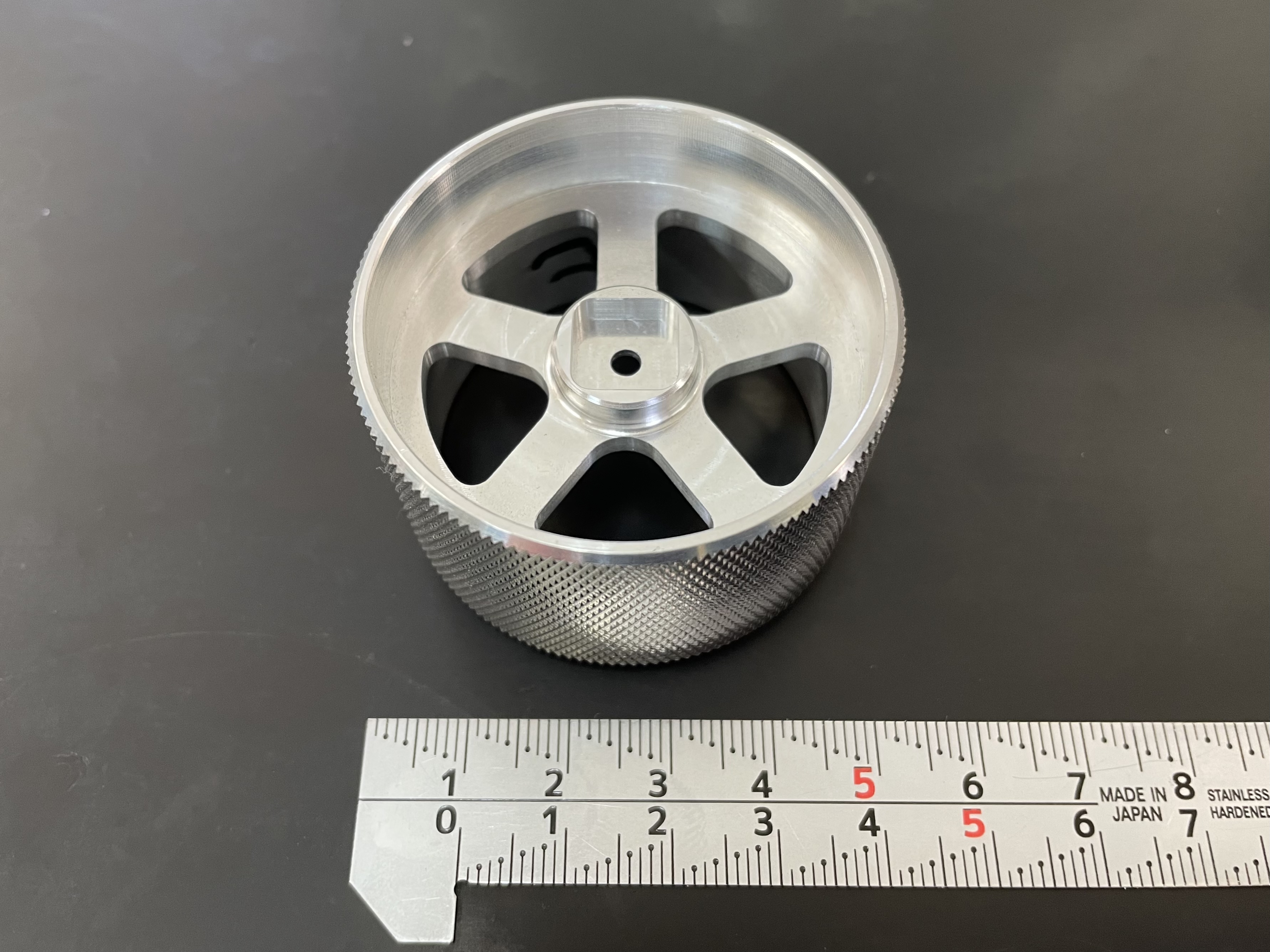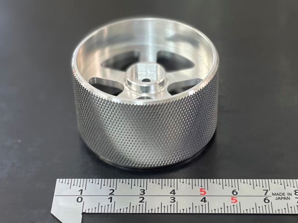 - 外周は汎用旋盤にてアヤ目ローレット後マシニングにてフル削り出し。